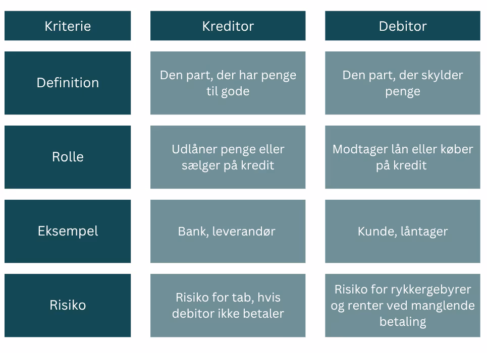 En kreditor er den, der har penge til gode, f.eks. en virksomhed, der har leveret en ydelse eller givet et lån. En debitor er den, der skylder pengene. Det vil sige, at kreditoren venter på betaling fra debitoren.