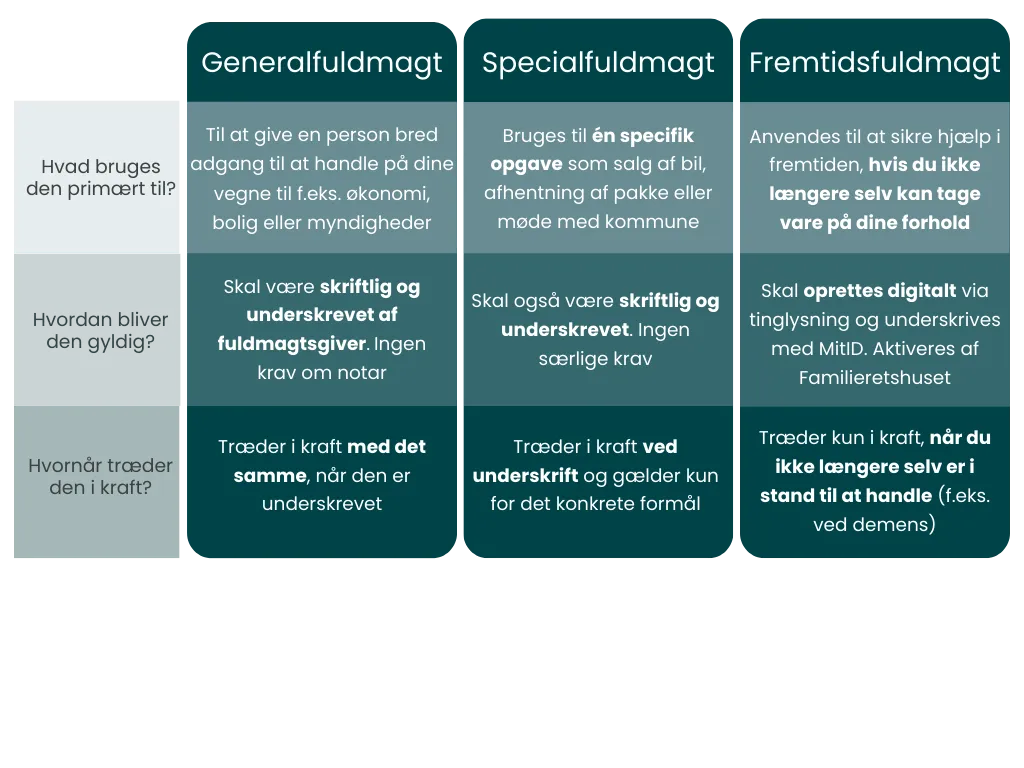 En almindelig fuldmagt træder i kraft med det samme eller på en bestemt dato – en fremtidsfuldmagt træder kun i kraft, hvis du ikke længere kan handle selv.